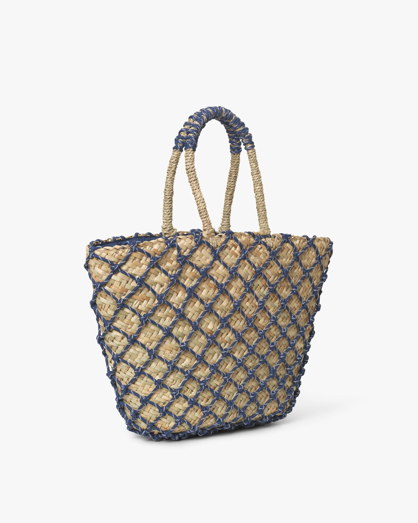 Den här flätade stråväskan kombinerar en klassisk form med unika detaljer, som ett nätmönster i knuten snodd som även är lindad runt handtagen. Väskan har ett öppet huvudfack och en innerficka i svart fuskläder för småsaker.
