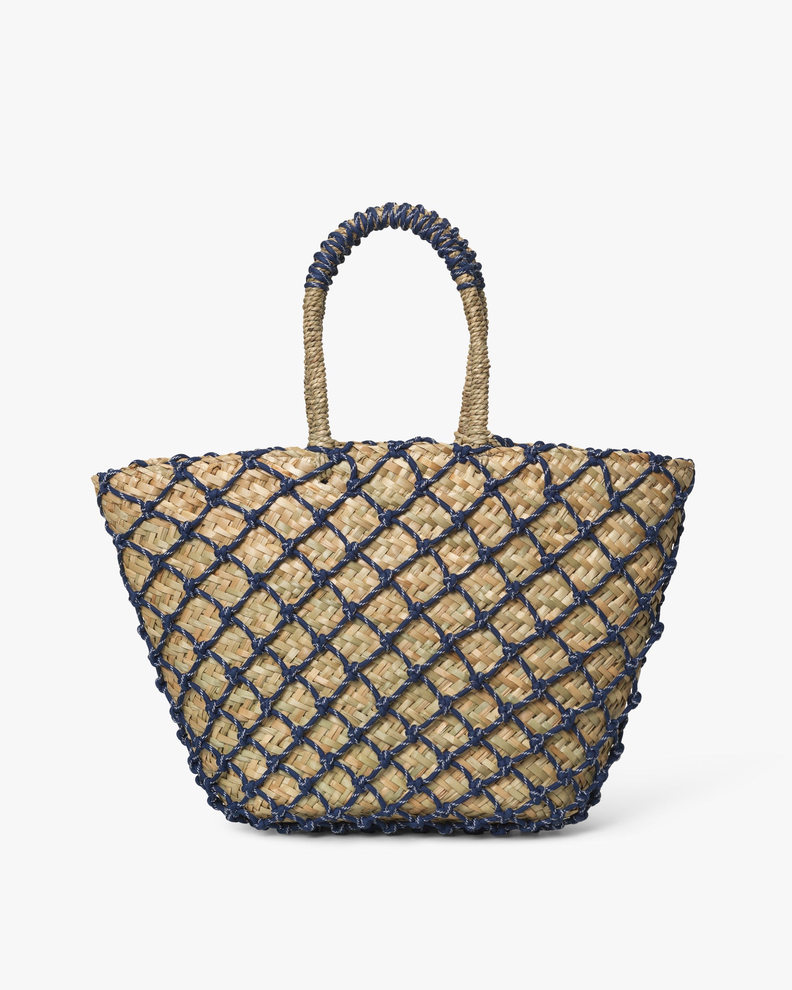 Den här flätade stråväskan kombinerar en klassisk form med unika detaljer, som ett nätmönster i knuten snodd som även är lindad runt handtagen. Väskan har ett öppet huvudfack och en innerficka i svart fuskläder för småsaker.