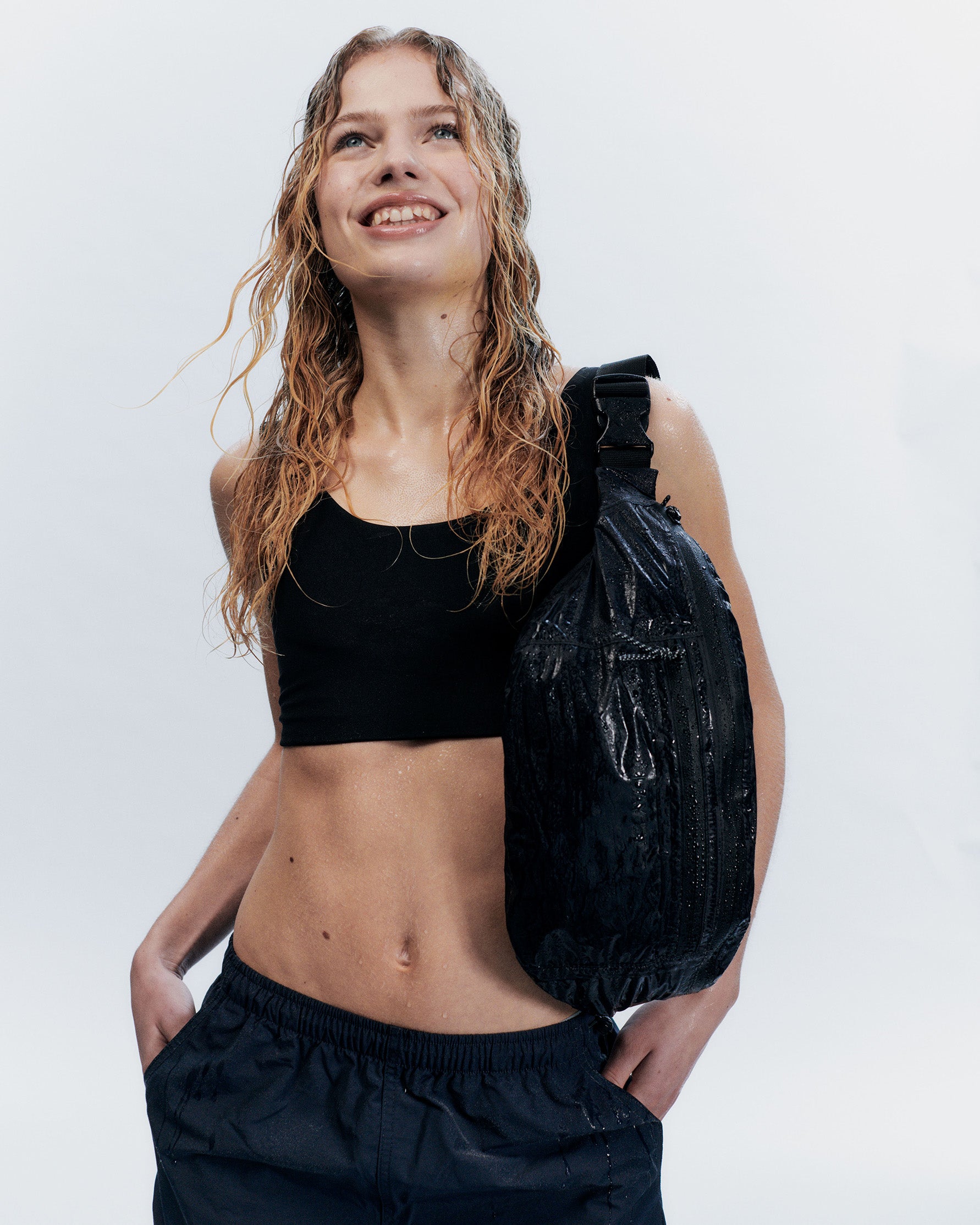 Denne funktionelle bæltetaske er designet i et genanvendt vandafvisende materiale. Den lukkes med en vandtæt lynlås, og den har både en indvendig og en udvendig lomme. Taskens strop er justerbar og har et spænde, så den kan tilpasses. Den er designet i et letvægtsmateriale og kan både bæres som crossbody og rundt om maven.