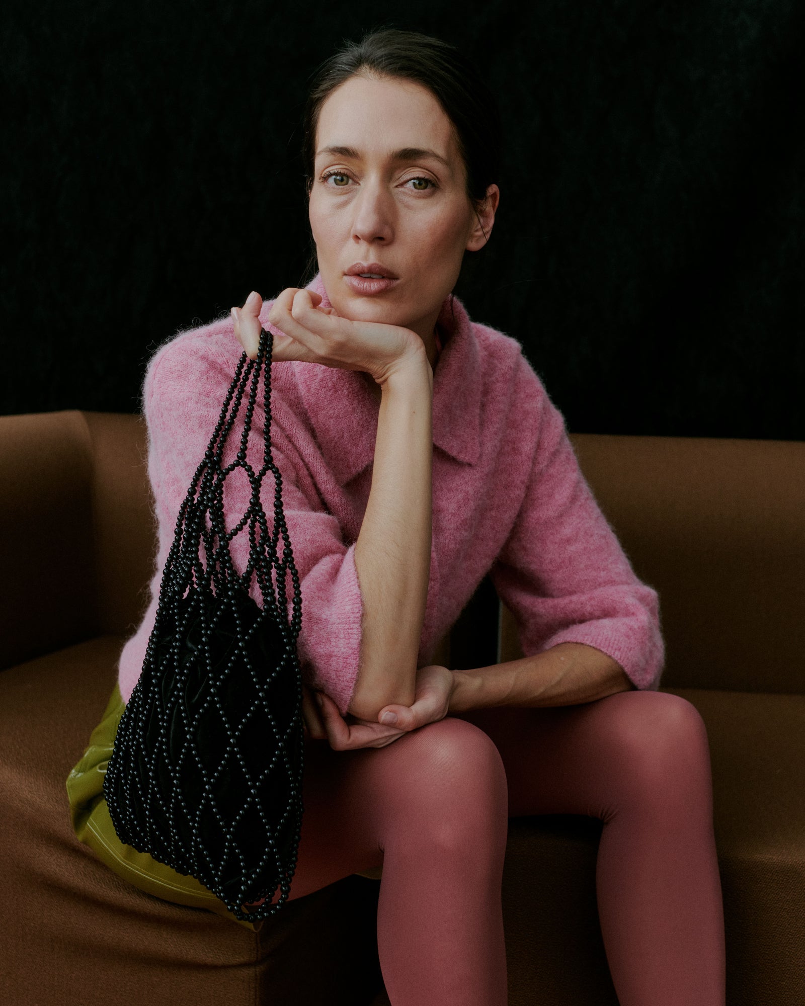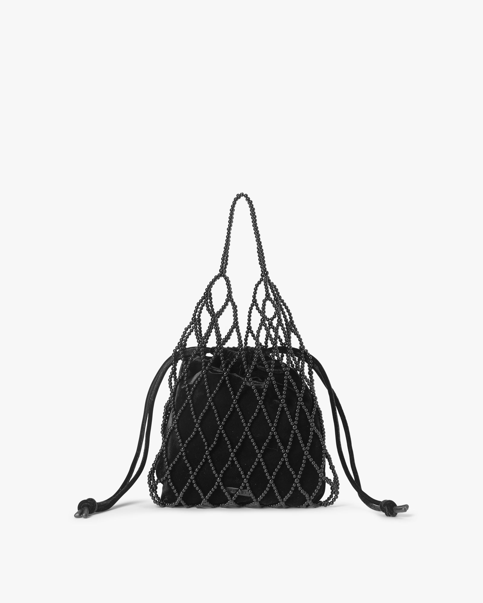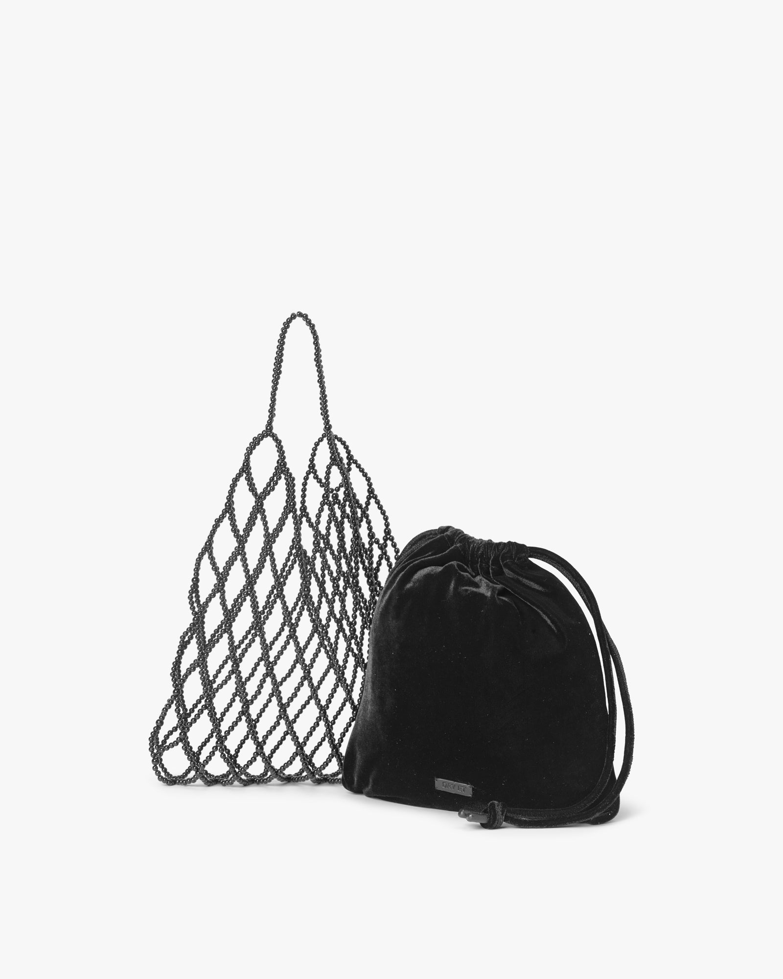 Denne elegante taske er skabt i sorte perler og har et let design i et netmønster. Indvendigt findes sort velourpose med snørelukning, der holder dine ting på plads. Tasken kan bæres både i hånden og over skulderen – et legende og dekorativt valg til både hverdag og fest.