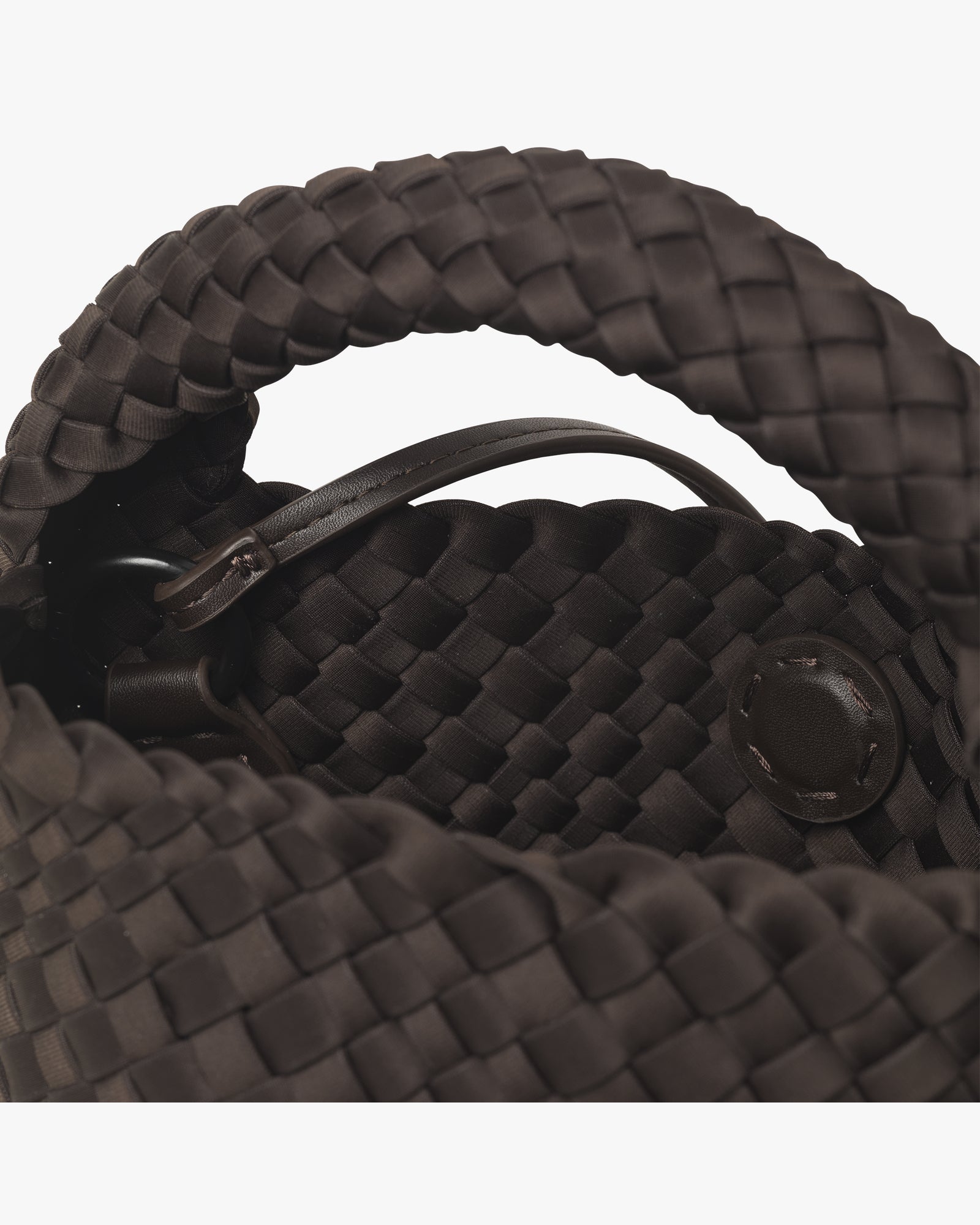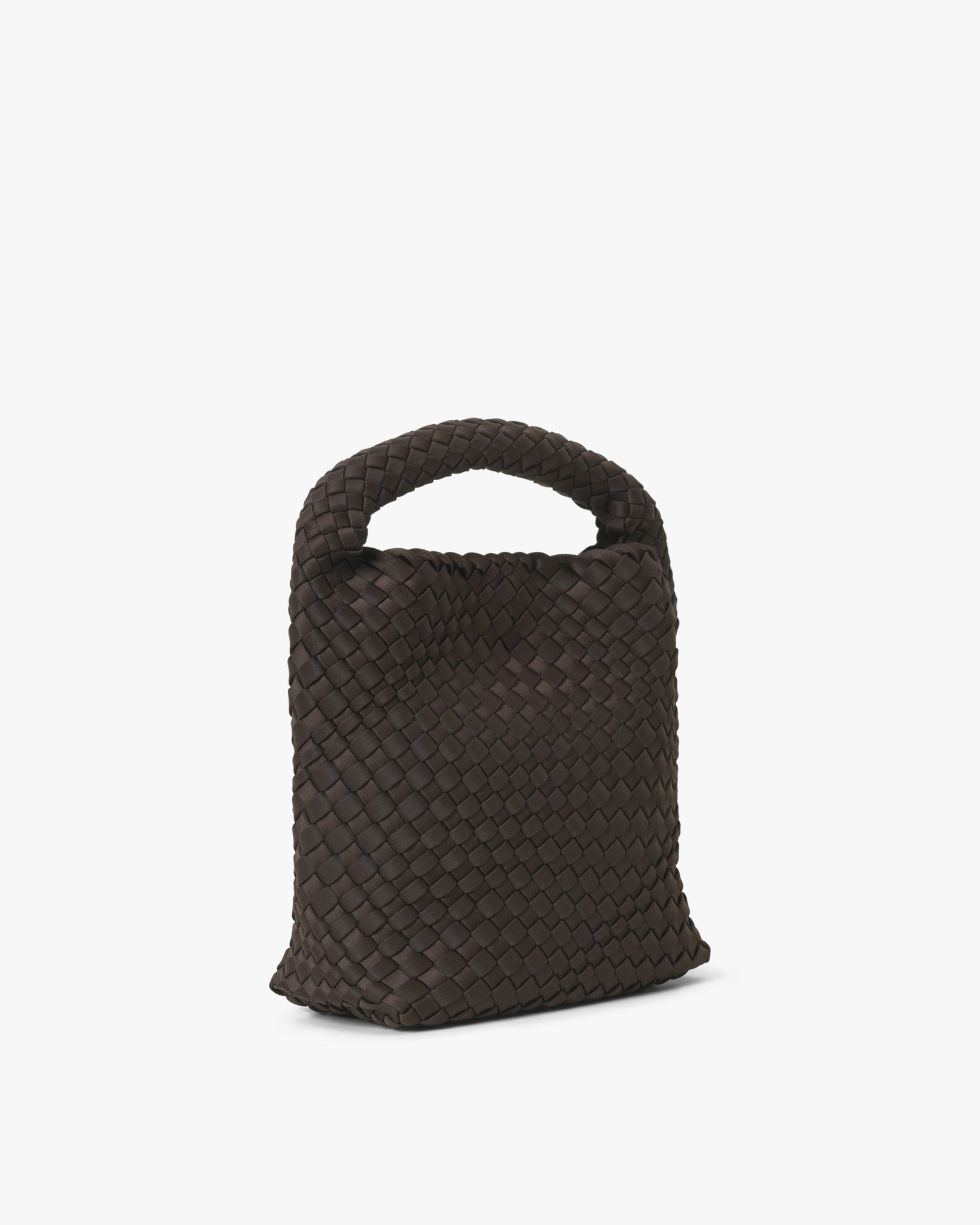 Denne håndtaske er håndflettet i ét stykke i et opgraderet neoprenmateriale med en blød og fleksibel struktur. Den har en forstærket bund, som giver god stabilitet, og tasken lukkes med en diskret magnetisk knap. En aftagelig crossbody-strop i imiteret læder gør det nemt at skifte udtryk og bære den som det passer dig – en alsidig taske med et særligt håndlavet præg.
