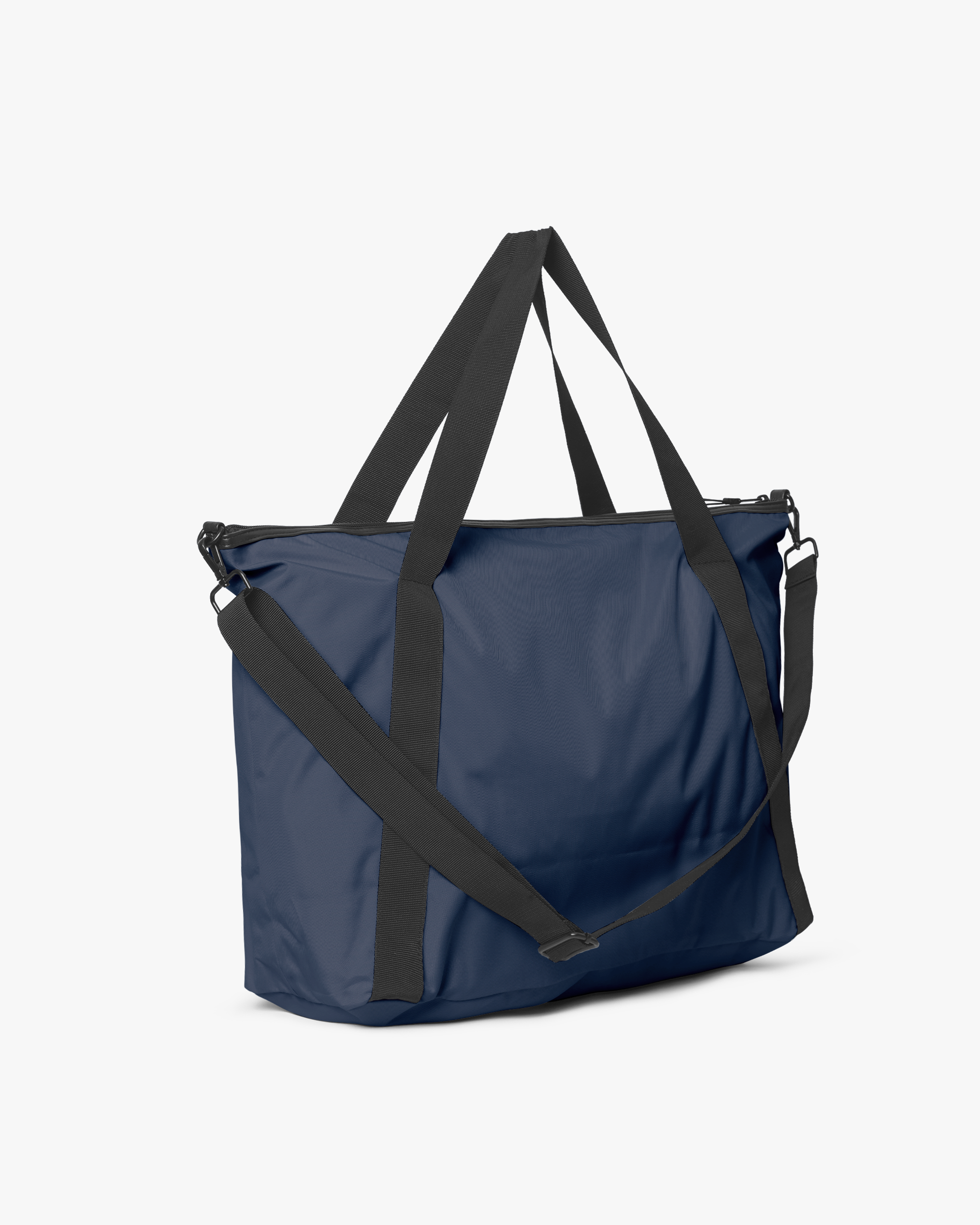 Denne taske har plads til alt hvad du har brug for til en weekend tur, og dens ydre stof og inderfor er lavet af genanvendt materiale. I hovedrummet er der en indvendig lynlås lomme, hvor du kan opbevare dine mindre sager. Udover de to kortere håndtag har tasken også en aftagelig og justerbar strop, så den både kan bæres over skulderen og som crossbody.