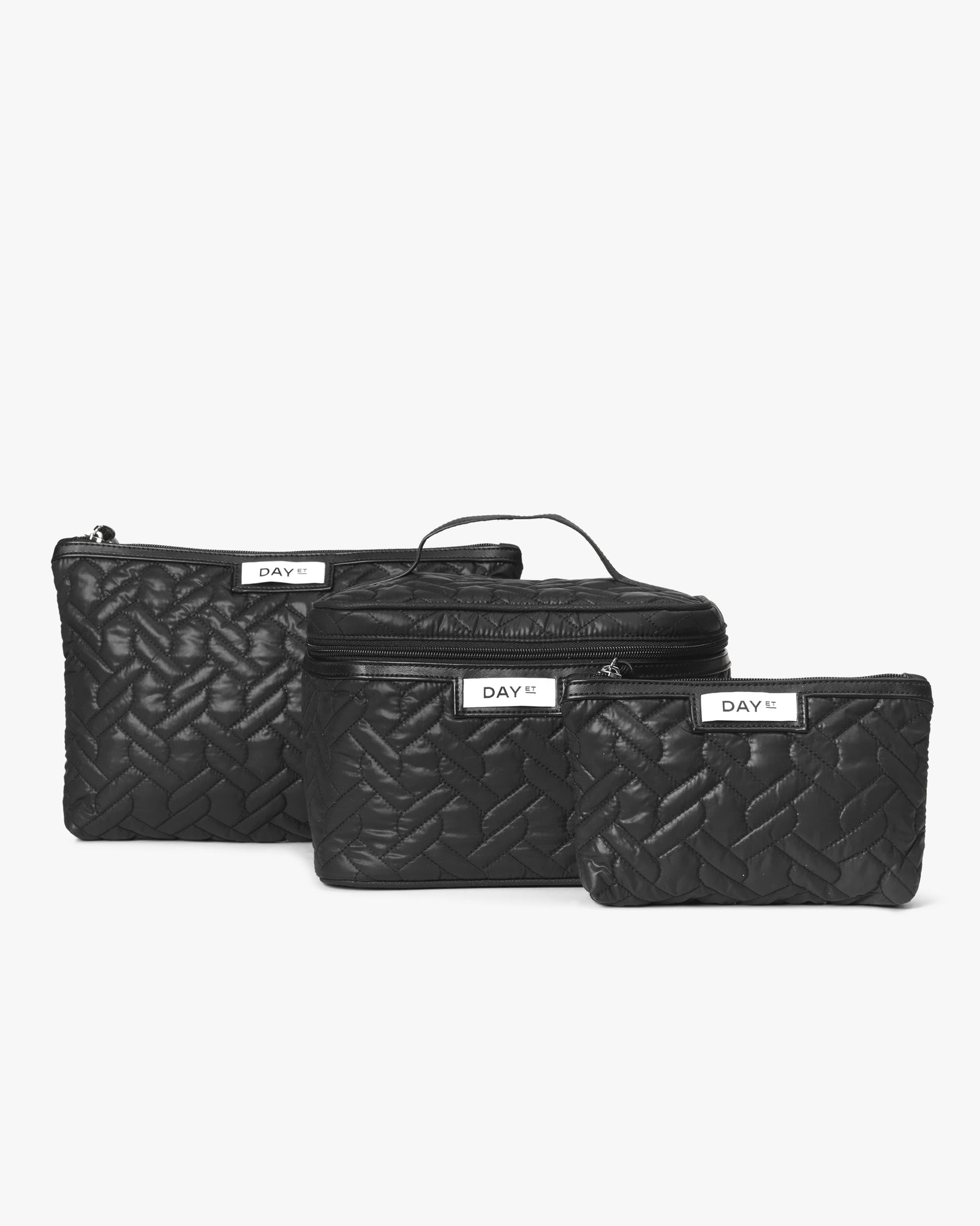 Detta kit är perfekt för förvaring av toalettartiklar, skönhetsprodukter och smink. Yttertyget och innerfodret är tillverkade av 100 % certifierat återvunnet material. Setet består av en make-up take, en större necessär och en mindre sminkpåse. De stängs med dragkedja och är designade i ett randigt material.