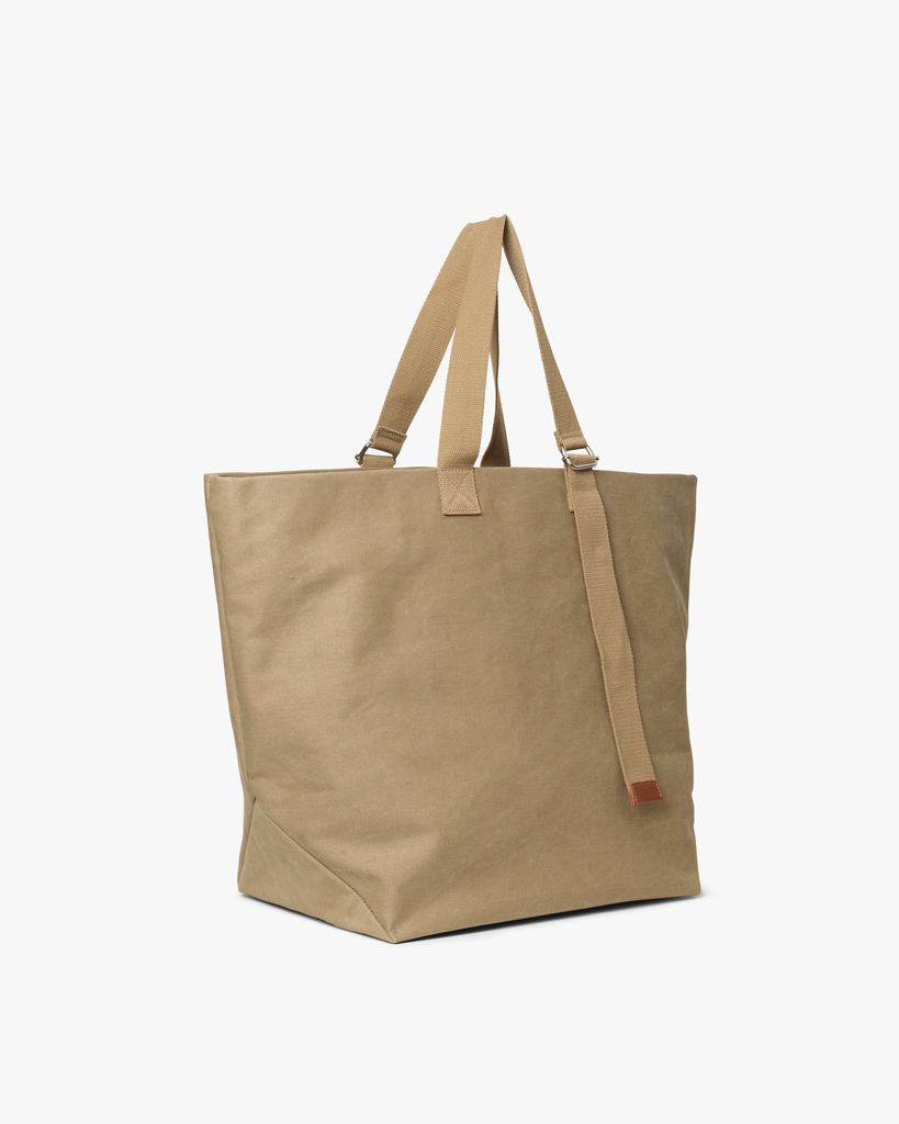 En rymlig shopper-väska tillverkad i kraftig bomullscanvas med ett naturligt, avslappnat uttryck. Den har två justerbara axelremmar med en hängande detalj och stängs med en hake. Invändigt finns en dragkedjeficka och en öppen ficka. Läderdetaljer och förstärkt botten ger extra hållbarhet.
